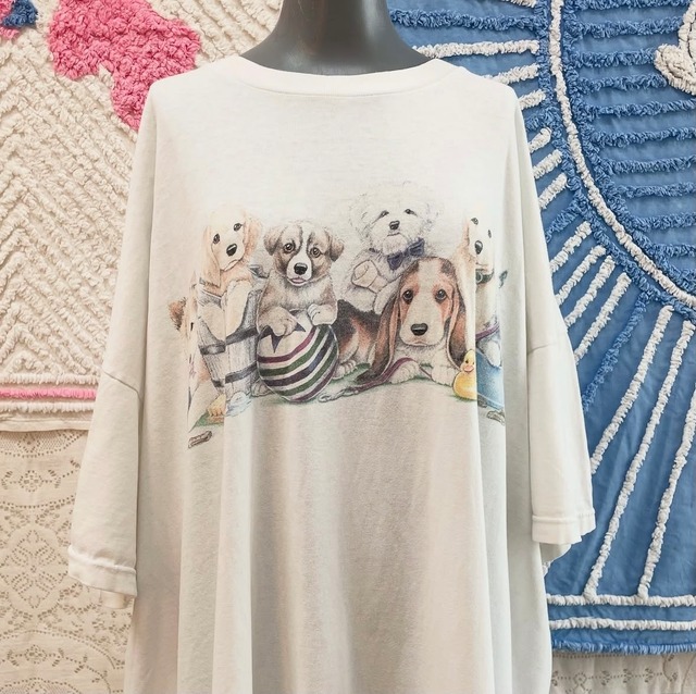 ピンクのボディとゴールデンのパピーが可愛いプリントです! 裾袖ともにシングルステッチ 素材表記は薄くなって確認できませんがcotton 100%かと思われます。 着丈 71 身幅 53.5 肩幅 47 ※BASEにアップしている商品は店頭にない場合がございますので、ご来店予定のお客様は事前にお問い合わせ下さい。