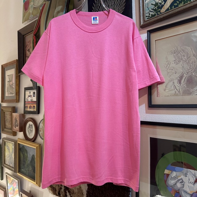 絶妙なピンクが可愛いラッセルの90's Tシャツです! 袖シングルステッチ デッドストックです! MADE IN USA M 着丈 68 身幅 48.5 肩幅 45
