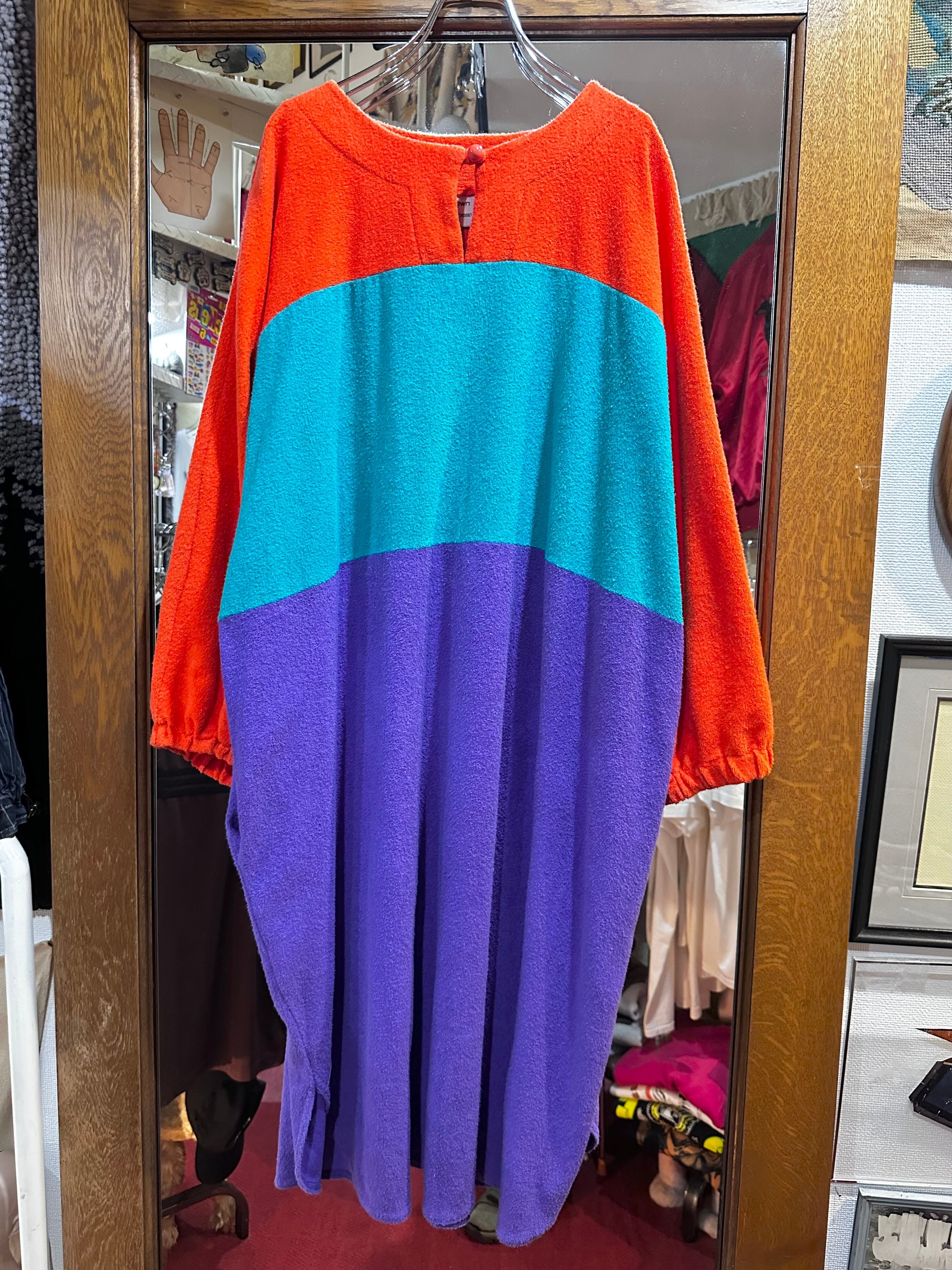 オレンジ×ターコイズブルー×パープルのグッドカラーリングが可愛いパイル織りワンピです。