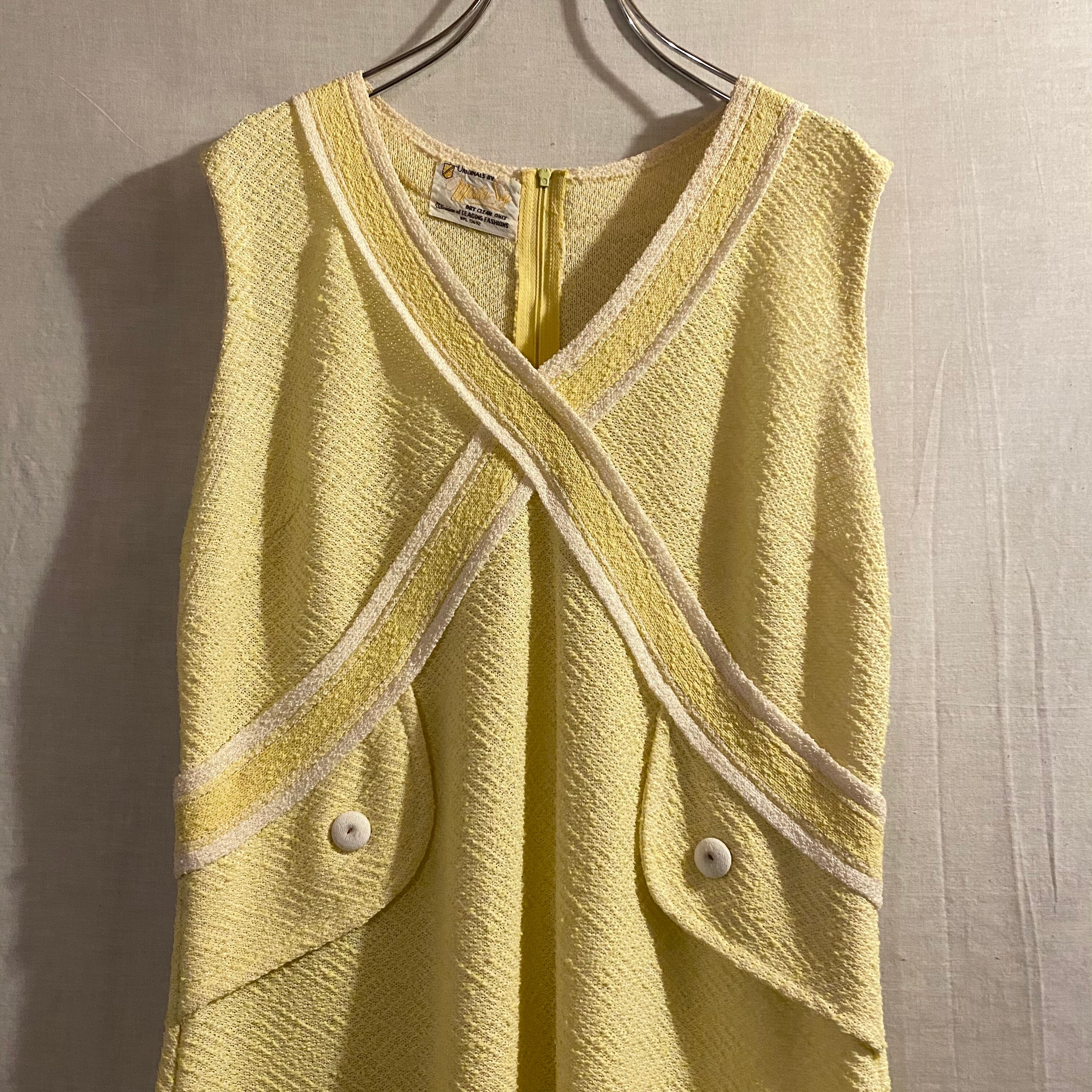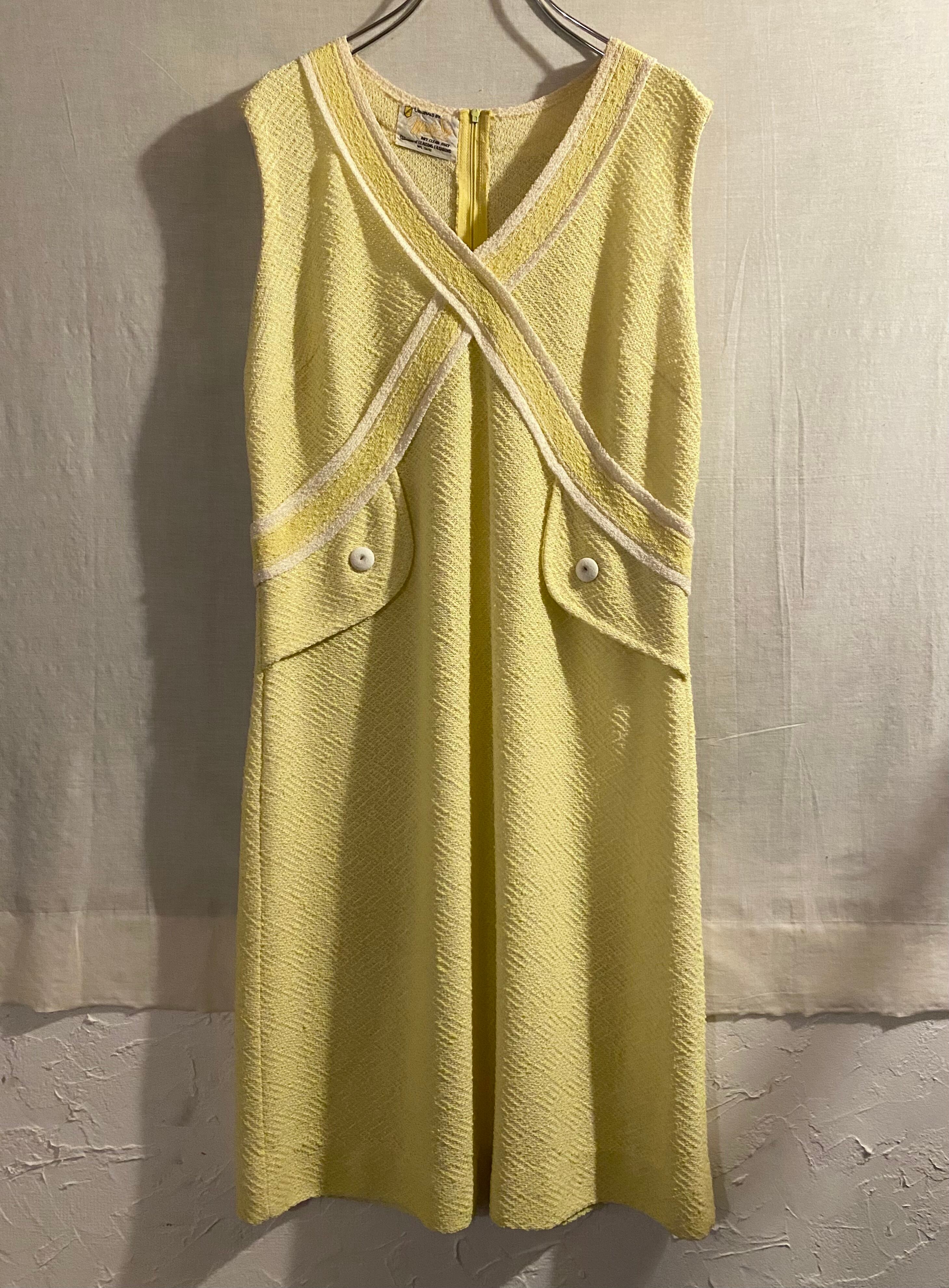 襟のクロスしたデザインと淡いレモンイエローカラーが可愛いノースリーブワンピです。