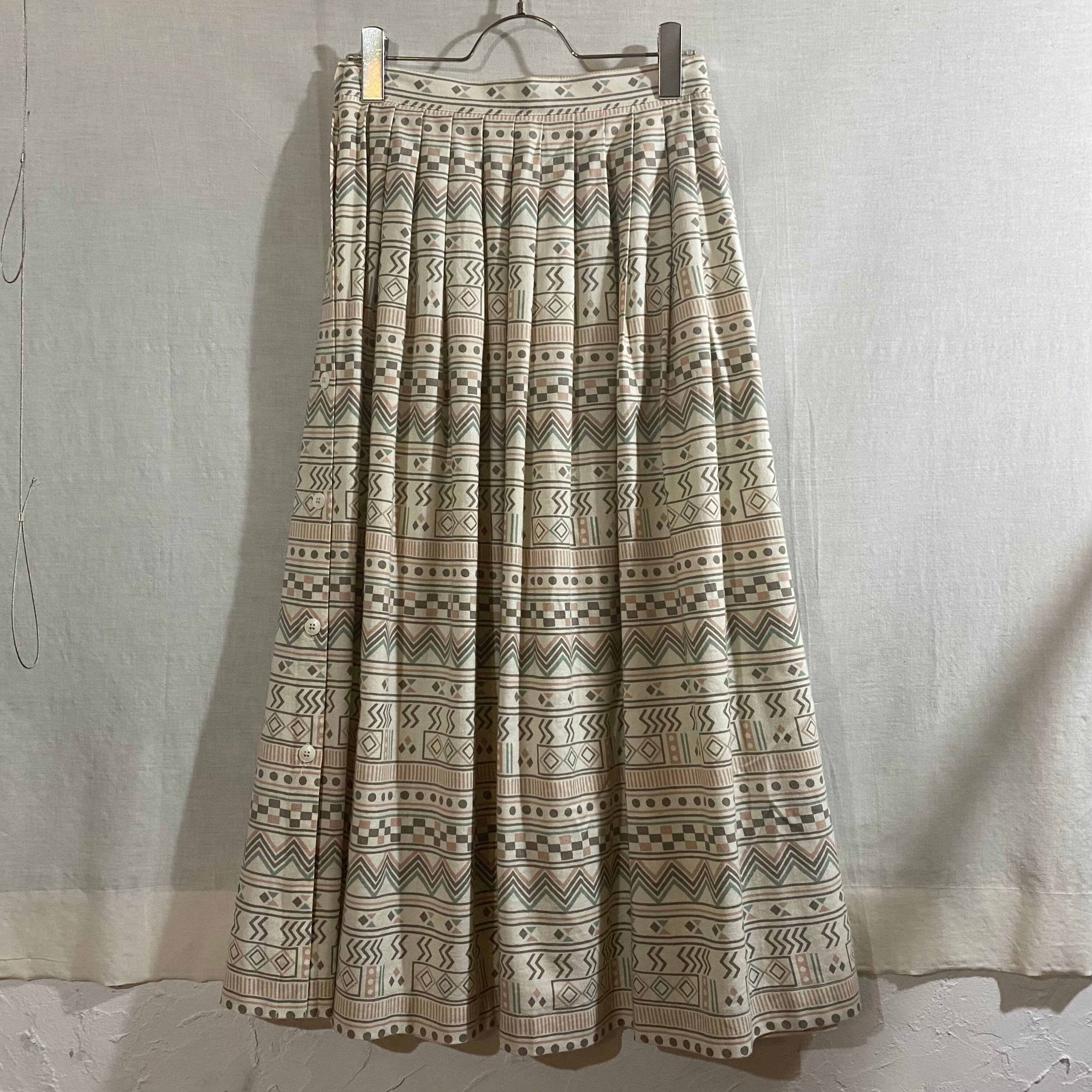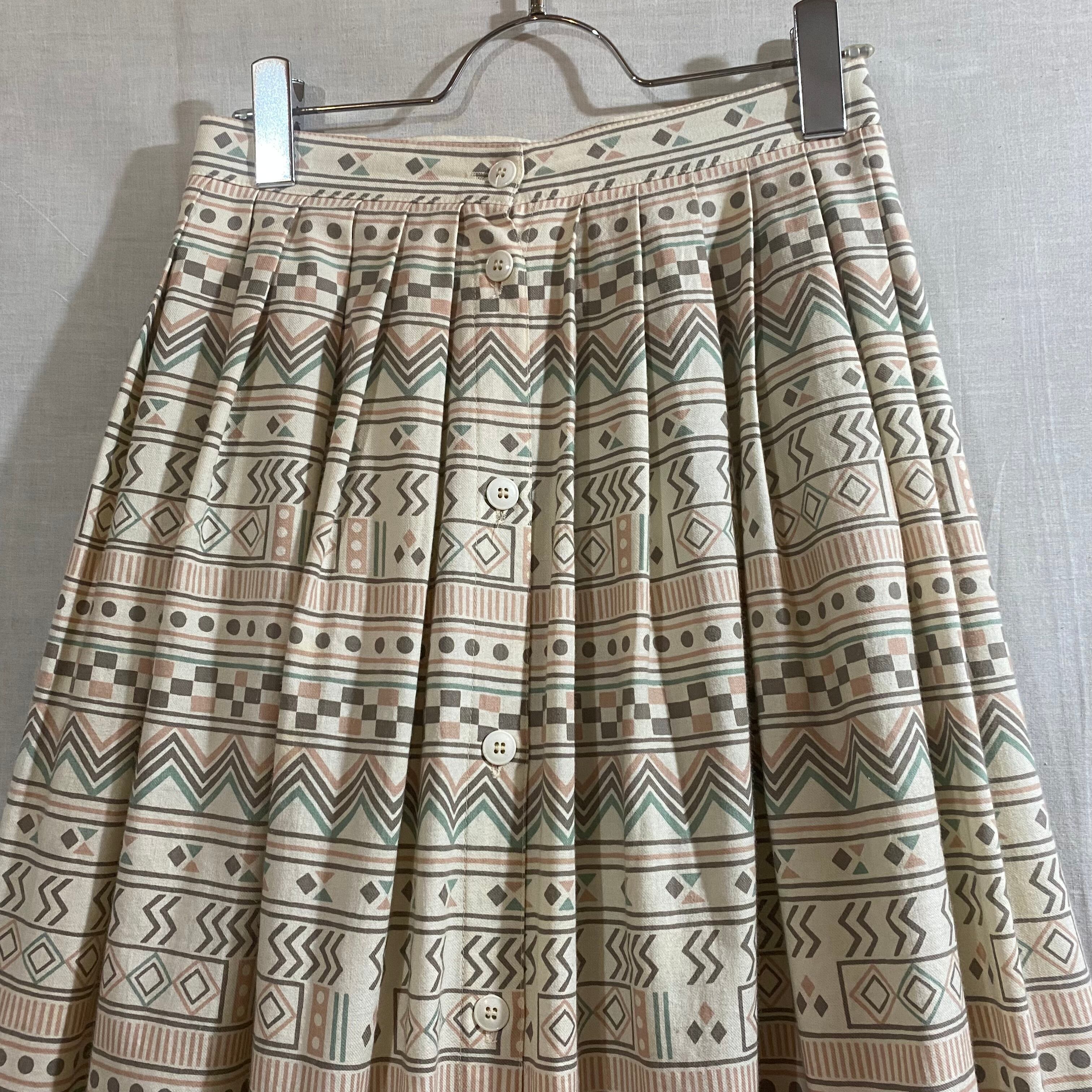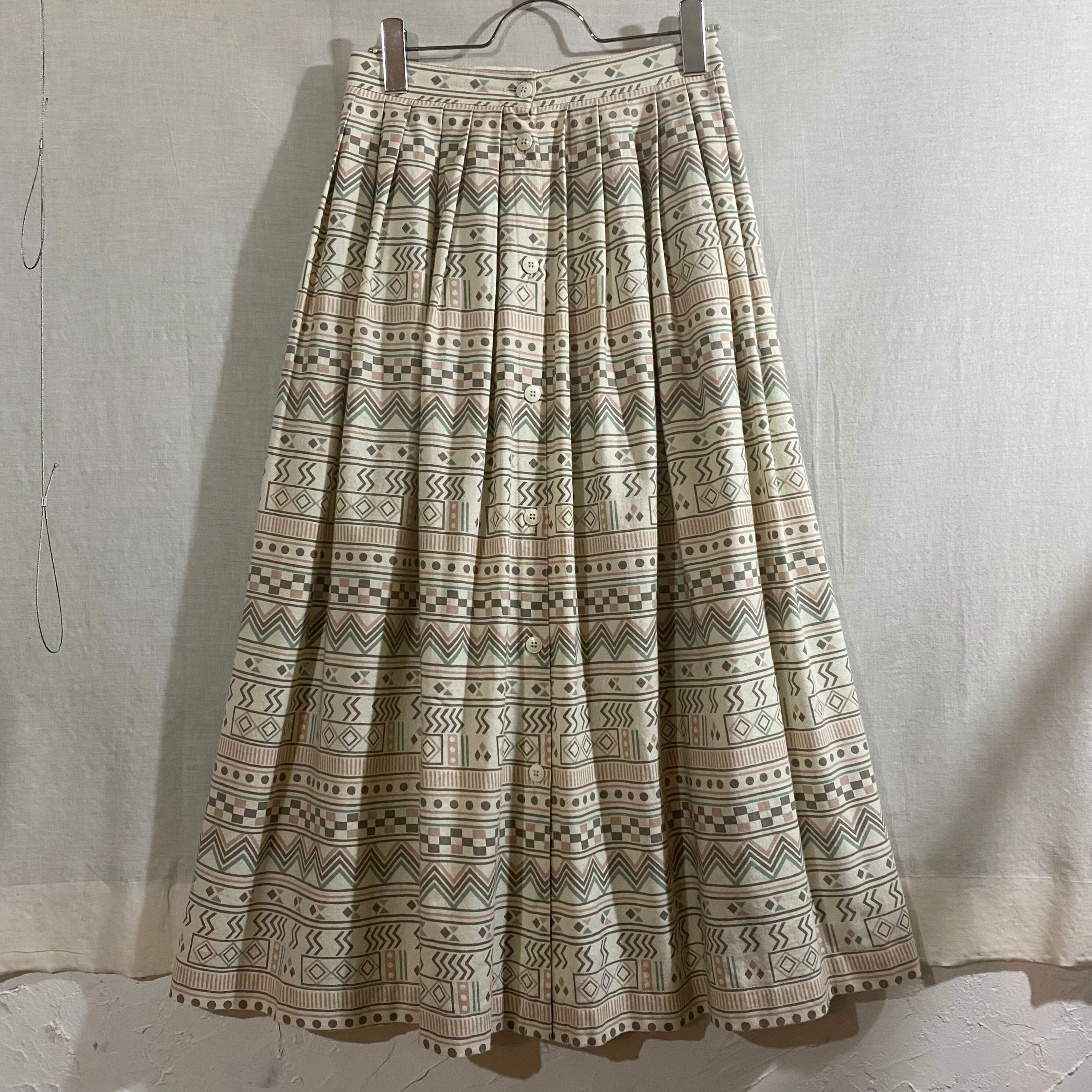 全体的に淡いカラーリングの幾何学柄が可愛いスカートです。