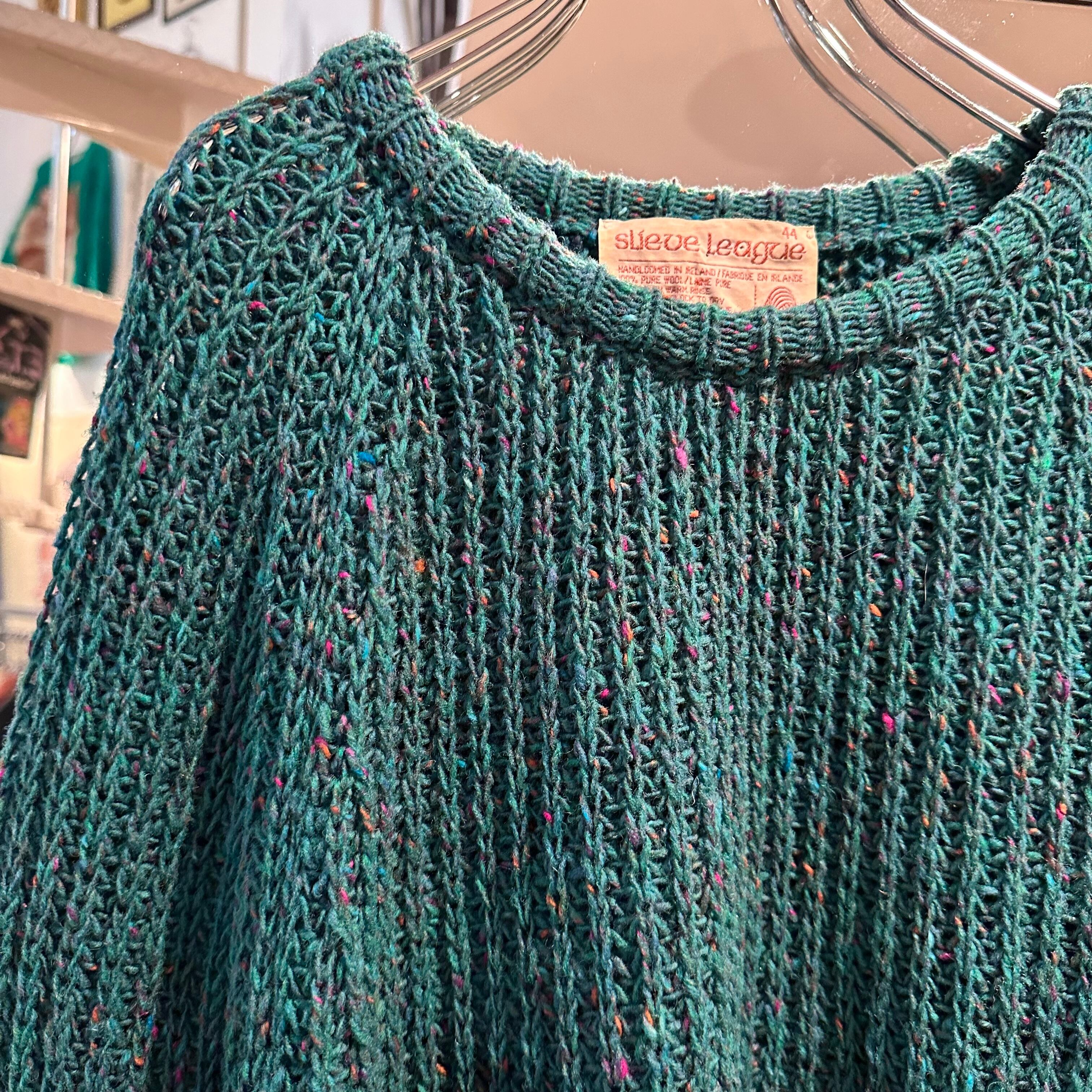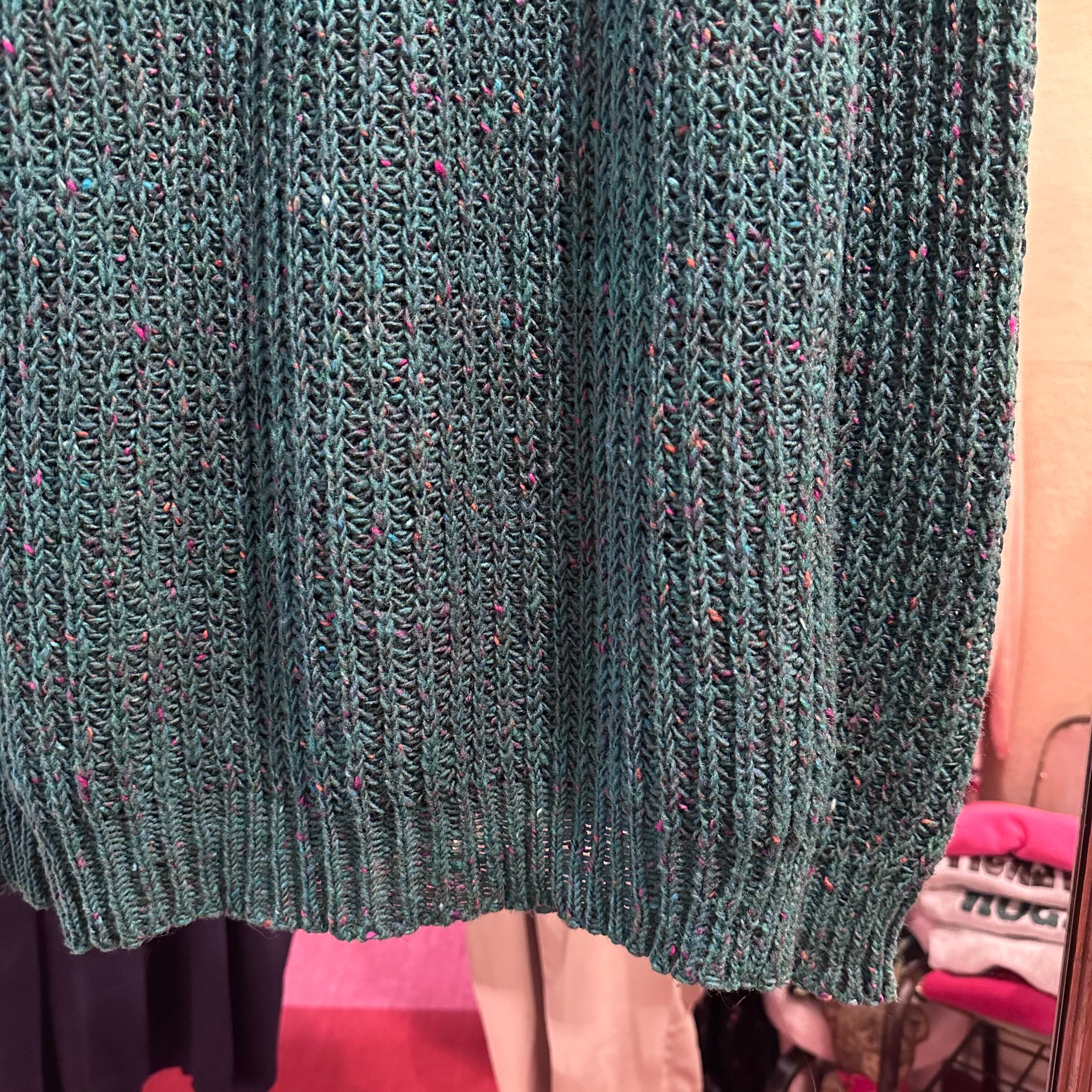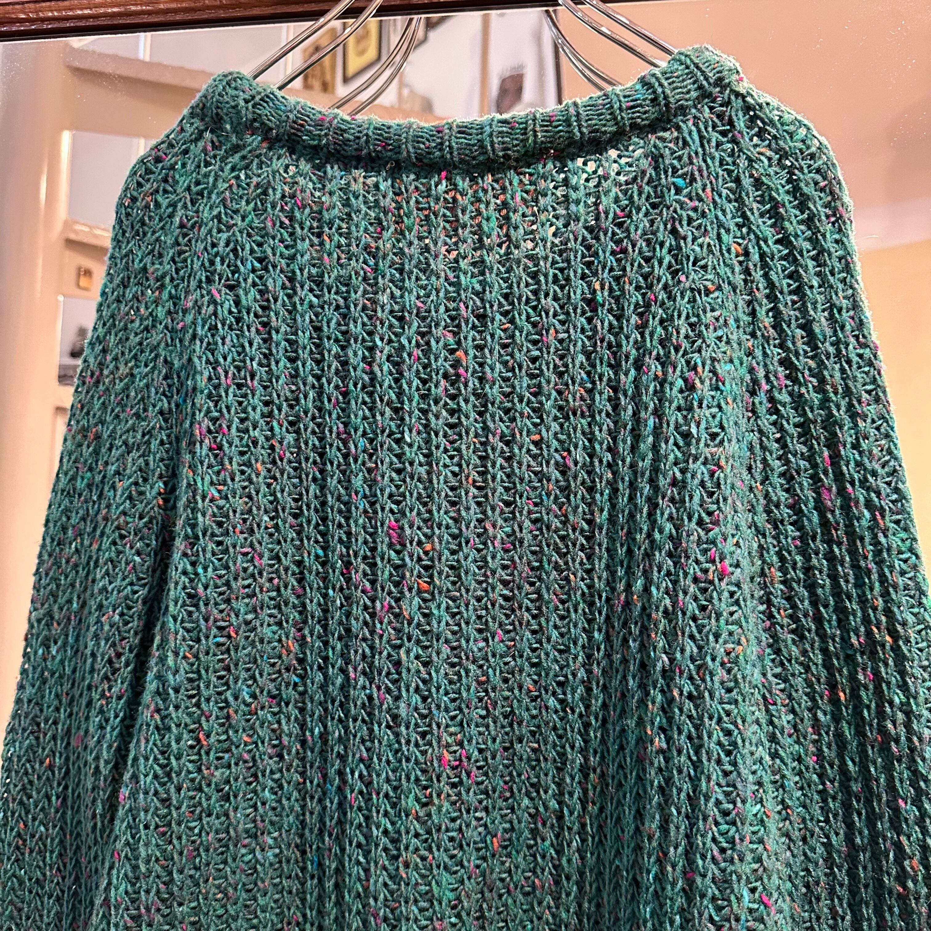 緑ベースの糸にカラフルな糸が混ざっていてとても可愛いアイルランドニットです!