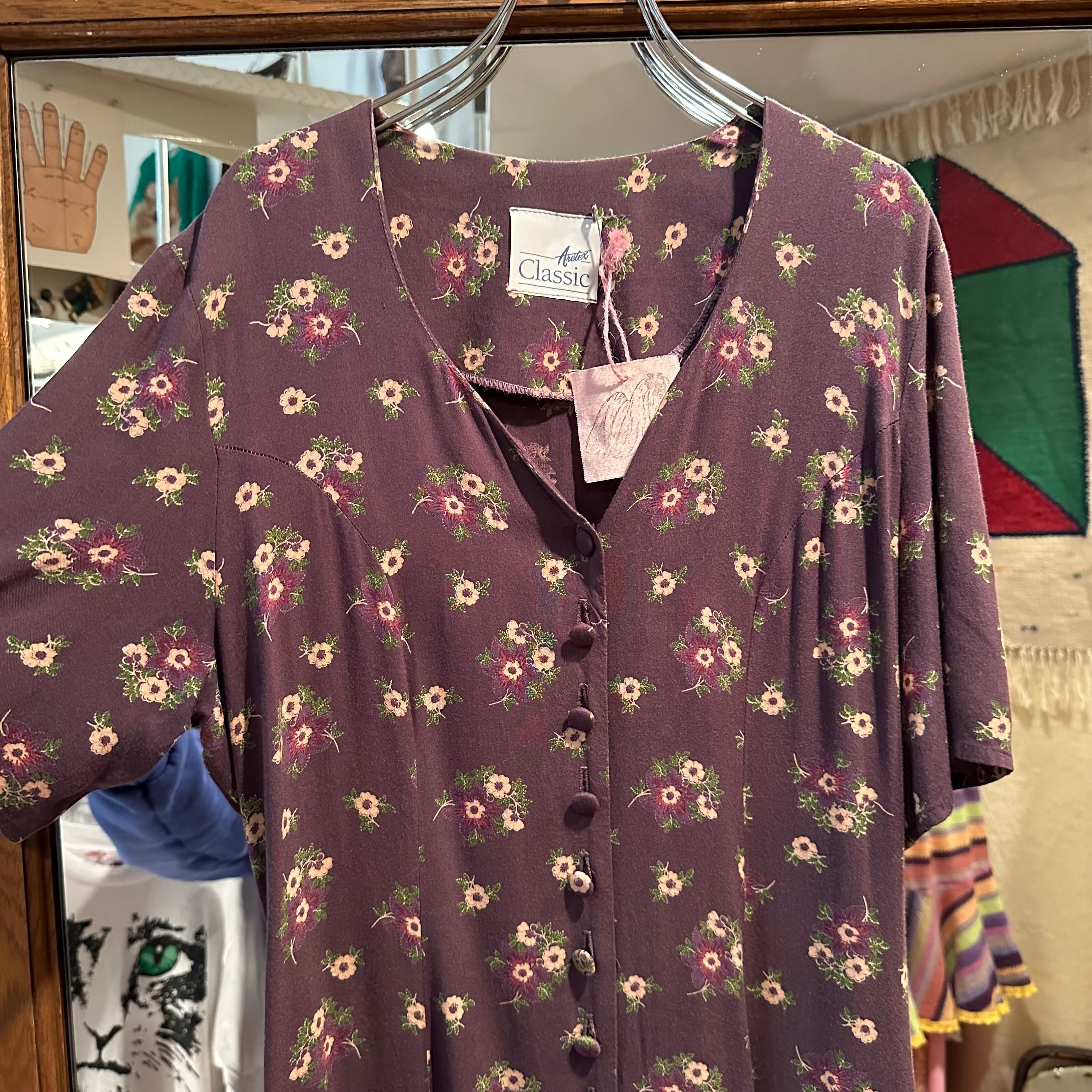 茶色に臙脂色を混ぜた様な絶妙な色合いとお花の総柄が可お上品なレーヨンワンピースです!