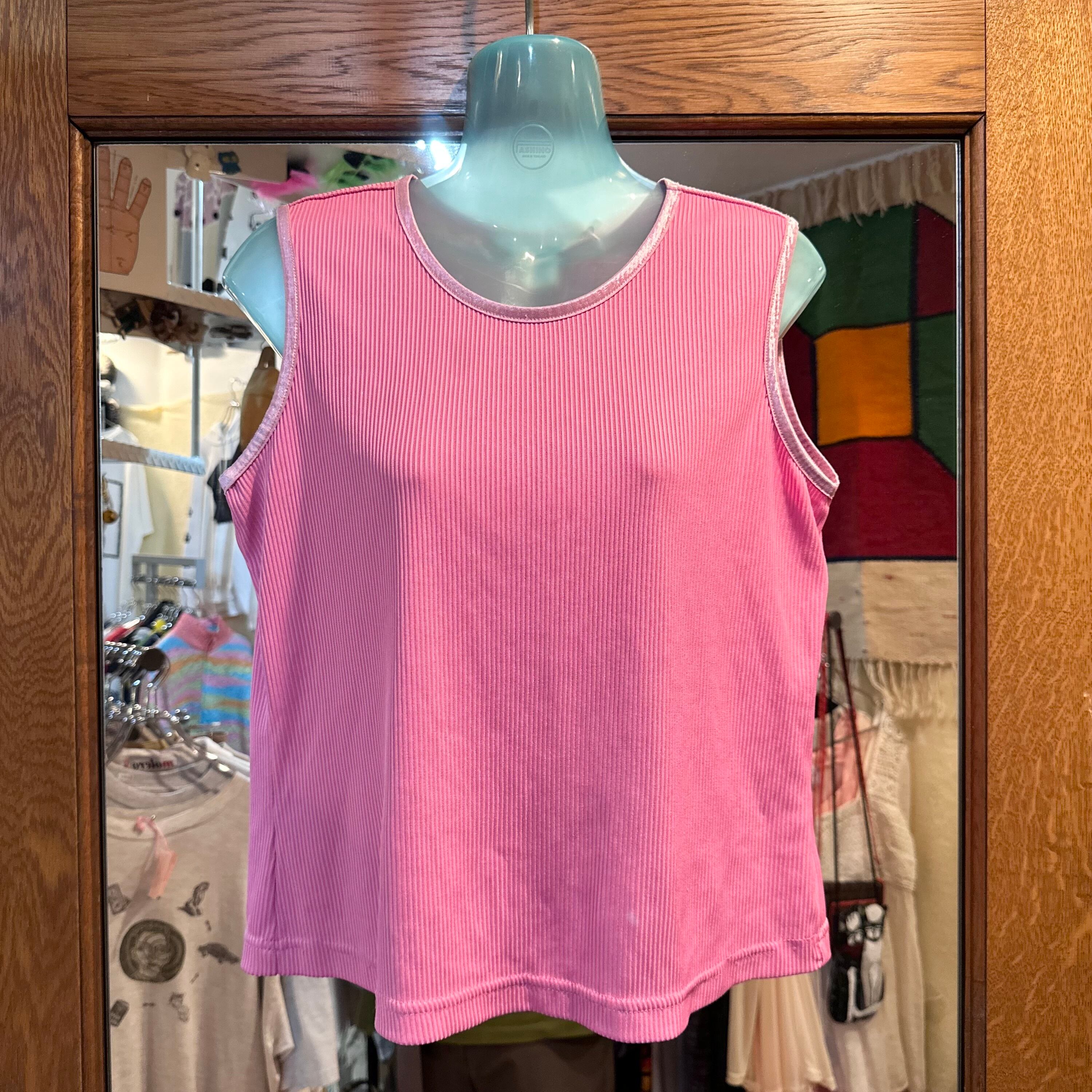 ピンクのリブ素材に光沢のある薄ピンクの縁が可愛いノースリーブトップスです!