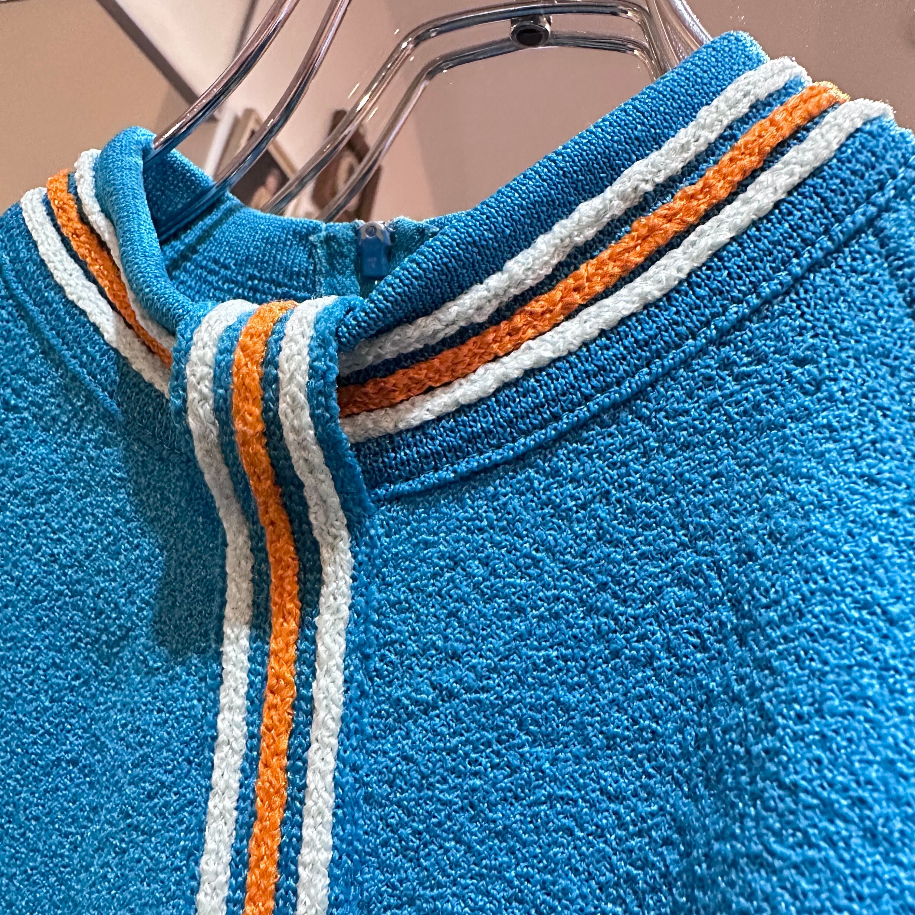 首周りと真ん中に入ったオレンジと水色のラインが可愛いニットトップスです!