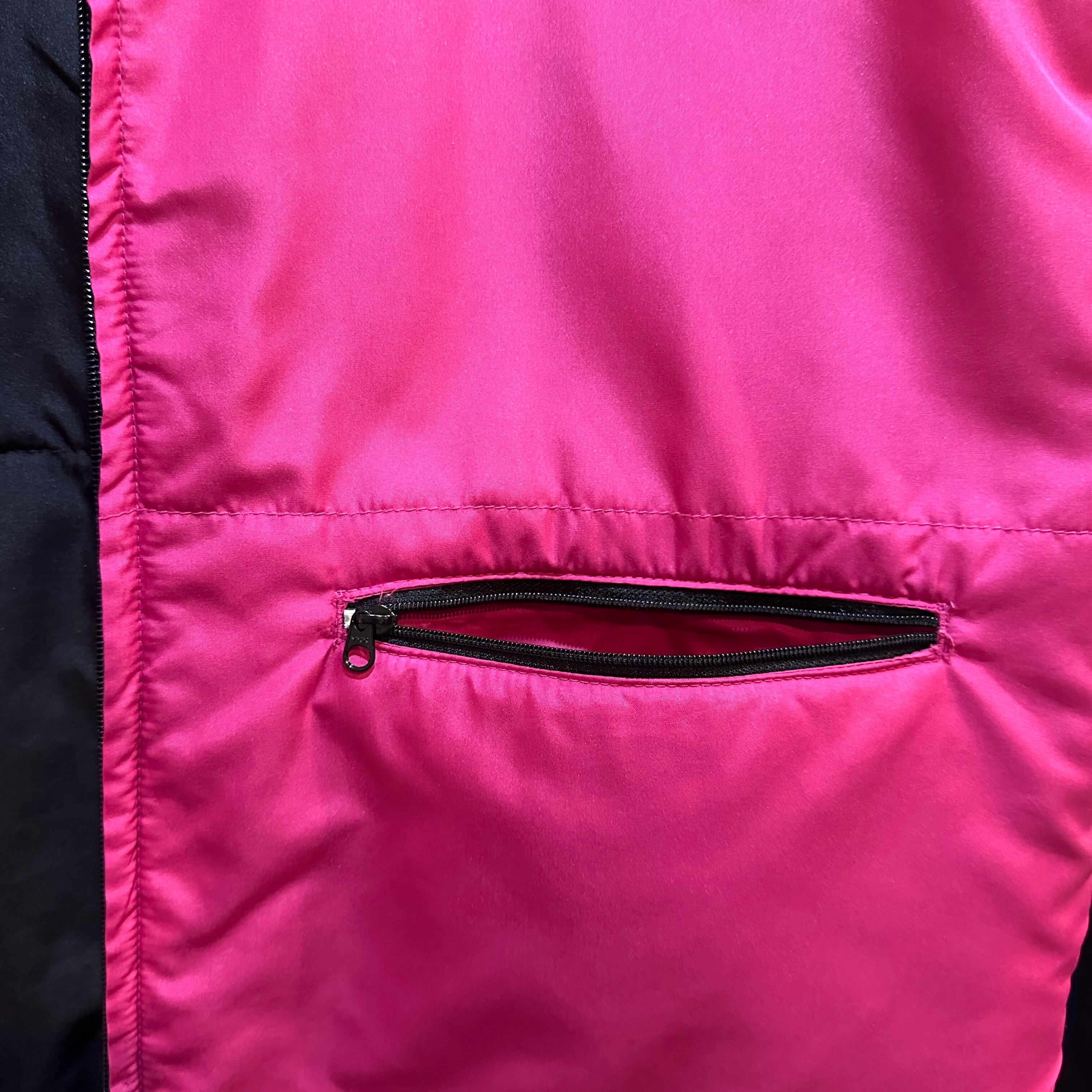 濃いめのピンクと左裾に付いたジップポケットが可愛いパデットベストです。