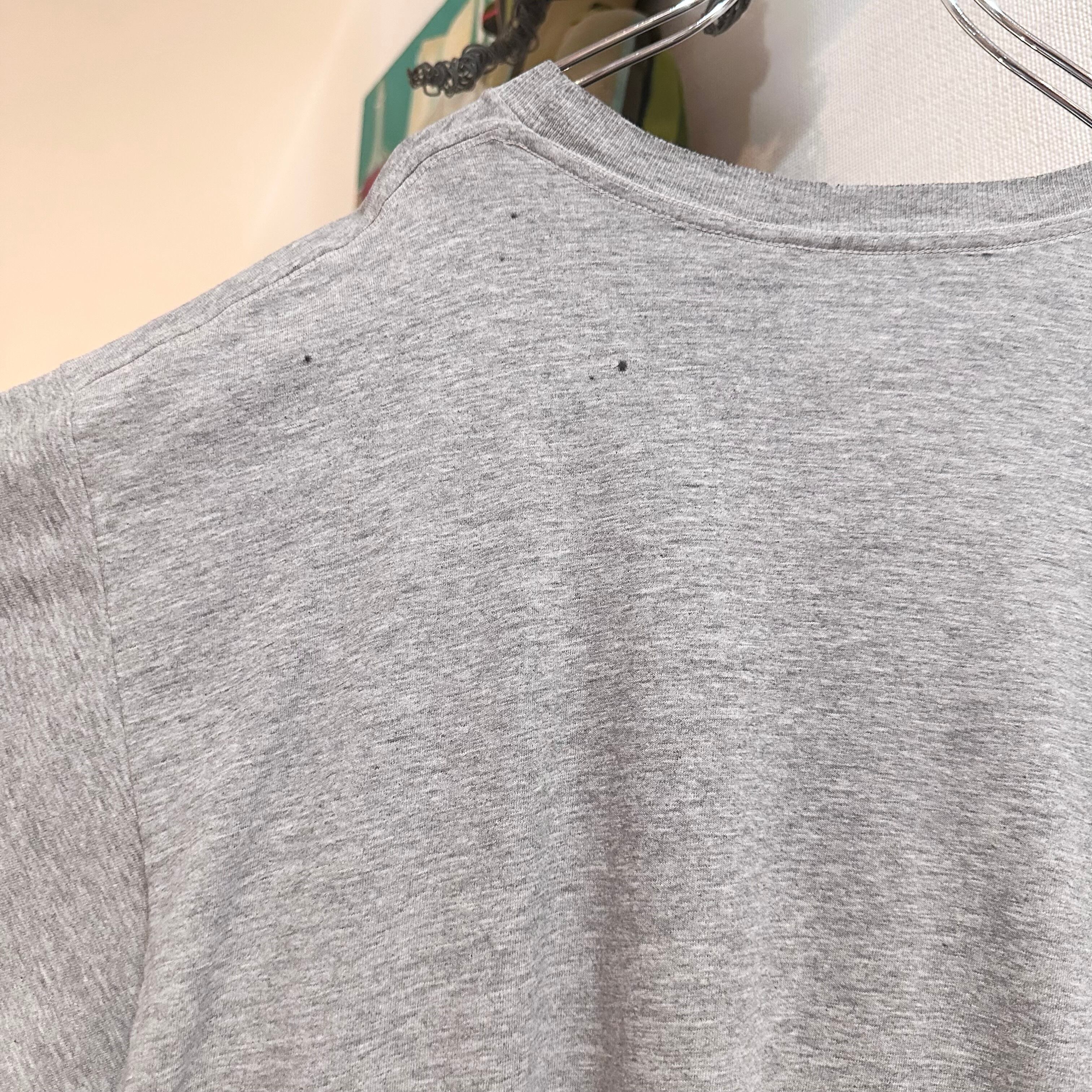 リブ周りにダメージ、プリントに穴、背中に黒いインク汚れがあります。